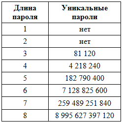 Вот, как количество уникальных паролей в этом случае зависит от длины текстового пароля и используемого набора знаков: